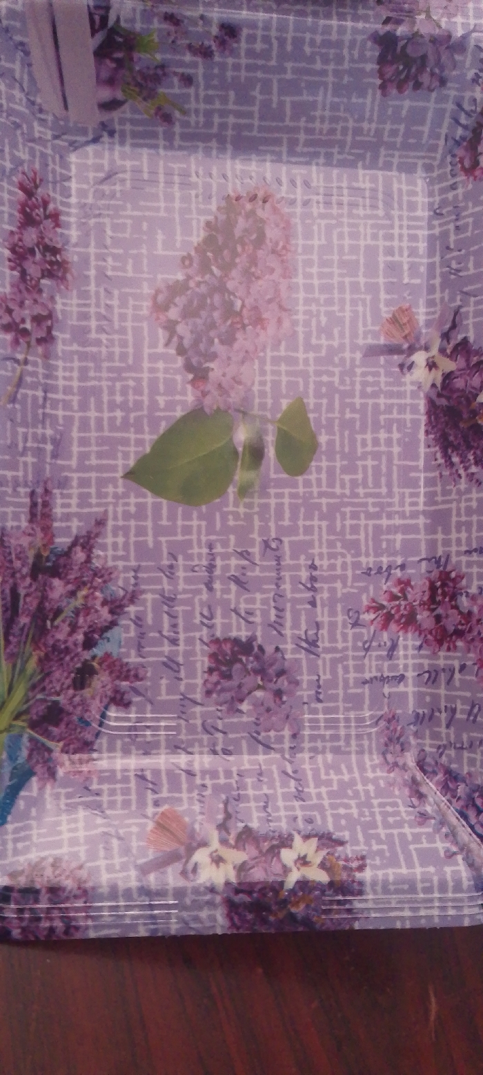 A decorative rectangular object, likely a serving tray or box lid, is depicted resting on a dark brown surface. The object's surface is light purple with a white, irregular grid pattern. It is adorned with multiple clusters of purple flowers, resembling lilacs and lavender, interspersed with green leaves and some white flowers featuring orange stamens. Faded, dark purple cursive script is integrated into the background design. A blue vase containing a bouquet of purple flowers is visible towards the lower-left quadrant. The object displays a shallow rim at its lower edge. No individuals are present, and no actions are discernible. The scene is located in Nsukka, Nigeria.