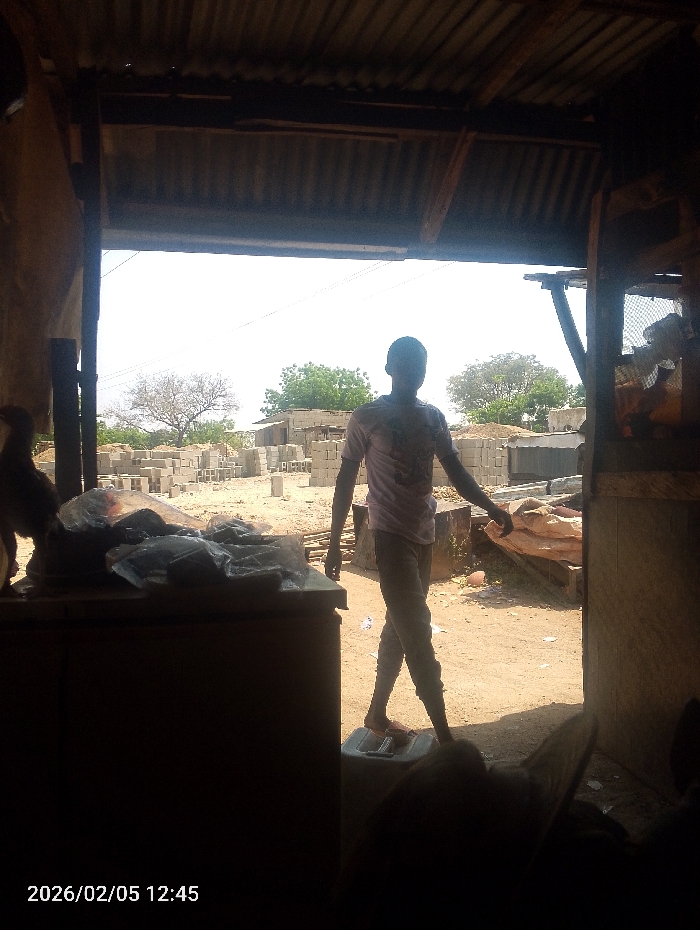 The scene depicts a view from inside a shadowed, open-fronted structure looking out onto a brightly lit outdoor area in Adankolo, Nigeria. The interior structure features a corrugated metal roof supported by wooden beams. In the immediate foreground on the left, a dark counter holds several dark, packaged items, likely in plastic bags. A heavily shadowed, partial figure is visible to the far left. A single individual, appearing male, stands centrally in the doorway, partially silhouetted. He wears a light-colored t-shirt with a faint design and light-colored trousers. His right foot rests on a low, light-grey platform, possibly a scale, while his left foot is positioned adjacent to it. His arms are slightly bent at the elbows. The exterior environment features unpaved, sandy ground. In the mid-ground and background, numerous stacks of grey concrete blocks are prominent, indicating a construction or block-making site. Scattered trees with varying foliage appear under a bright, clear sky. The image is timestamped "2026/02/05 12:45".