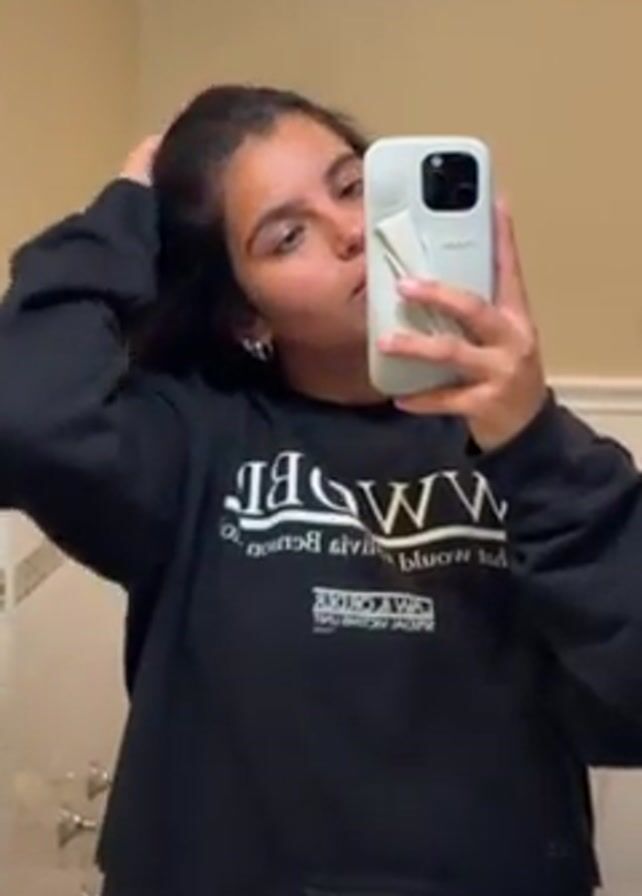 A young woman is taking a selfie in a bathroom mirror. She is wearing a black long-sleeved shirt with white lettering. She holds up her phone, which has a light blue case and a pop-up grip on the back. Her hair is dark and shoulder-length. She runs her hand through her hair several times as she looks at her reflection in the mirror. The bathroom has cream-colored walls and white trim, and there is a chrome faucet visible in the lower left corner of the frame.