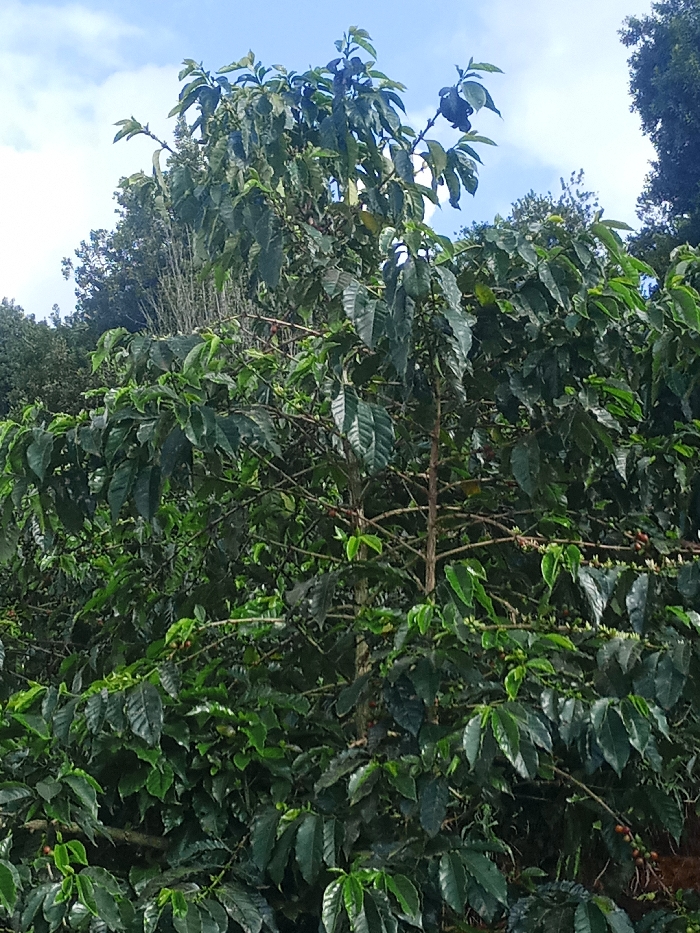 A vibrant coffee tree dominates the frame, its glossy green leaves densely packed on sturdy branches