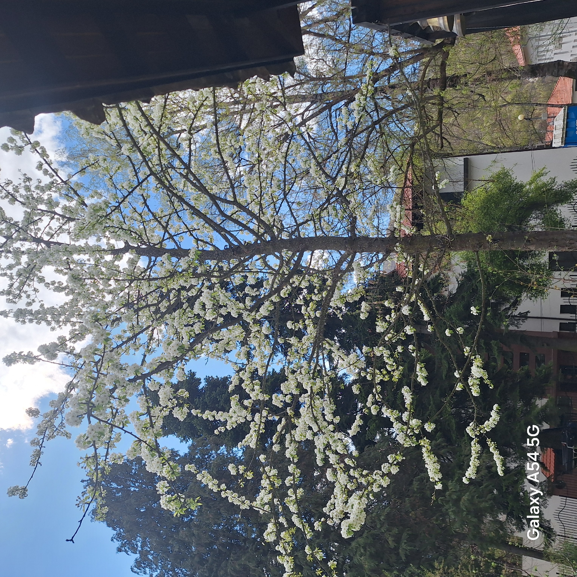 tree with white blossoms in the foreground, partially framed by a dark structure in the upper left. The background includes a blue sky with white clouds, various other trees, and some buildings. The text "Galaxy A54 5G" is visible in the lower right corner. The image may be located in the city of Iskrets, Bulgaria.