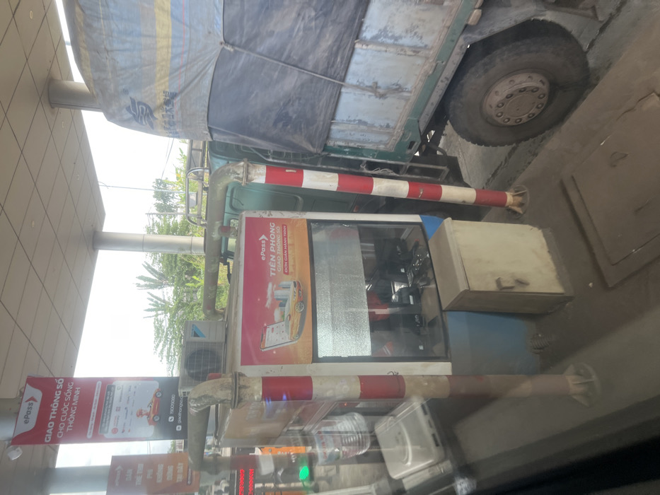 The image depicts a toll booth or checkpoint located in Thôn 1, Vietnam