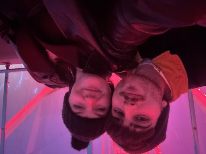 A selfie captures two people indoors. The scene is lit with pink and red light, creating a vibrant atmosphere. One person wears a black beanie with a pom-pom and a dark jacket. The other person sports a beanie and a black top with an orange collar. Their faces are close, suggesting a close relationship. The background is slightly blurred and features translucent panels.