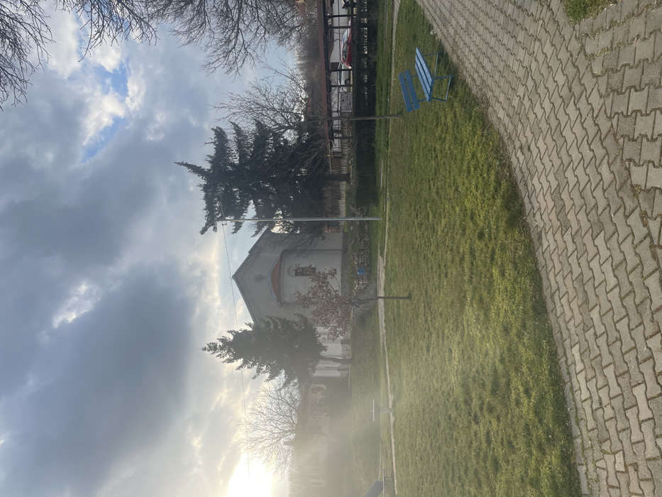 The image captures an outdoor scene in Ostra Mogila, Bulgaria, under a partly cloudy sky with visible sunlight. The foreground consists of an interlocking light-gray paver pathway running diagonally from the lower right towards the center, bordering a large expanse of vibrant green grass. A blue-painted wooden bench with a metal frame is positioned on the grass to the right of the pathway. In the mid-ground, a small, sparsely branched deciduous tree stands centrally on the grass. To its left, partially obscured by sunflare, is a silver children's slide and a low, circular structure, possibly a table, within a grassy area. The background features a light-colored building, consistent with a church or chapel, characterized by a rounded apse with a red-tiled roof on its right side and a small cross at the peak of its main roof. Two large evergreen conifer trees frame the building, one to its left and one to its right. A utility pole with overhead wires is visible to the right of the church. Further back, behind the trees and building, a long, open-sided covered structure, possibly a carport or sheltered walkway, is visible, under which a red car is parked. The sky above is a mix of dark and light gray clouds, with patches of blue visible towards the upper right. A prominent sunflare originates from the left side of the frame, creating a bright haze. No people are present in the scene.