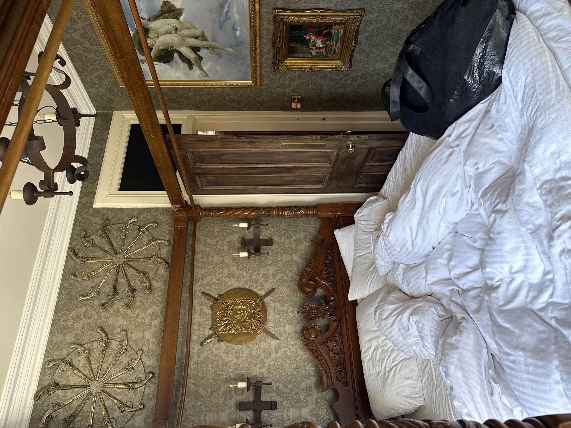 The scene is an interior bedroom in City of Edinburgh, United Kingdom. It features a four-poster bed with white bedding. A black bag rests on the bed. The walls are decorated with patterned wallpaper and adorned with decorative items, including two circular gun displays and a shield with swords. Two framed paintings hang above the bed's headboard, above a door that appears to lead to another room. A chandelier hangs from the ceiling on the left side of the image.