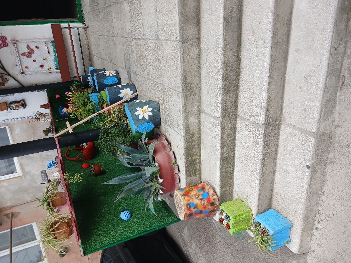 The scene depicts an outdoor staircase leading to a decorated entryway or courtyard in Rustavi, Georgia. The foreground features a concrete staircase with five visible steps, exhibiting minor weathering and surface dirt. On the bottom step to the left, a light blue rectangular planter with small succulents is present. The second step holds a lime green rectangular planter also containing small succulents. The third step displays a multi-colored cylindrical planter, possibly a painted tree stump, filled with foliage. Above the stairs, a paved area extends to a decorative garden space. To the left, a dark-colored vehicle is partially visible. A vertical section of green artificial turf creates a backdrop for several potted plants, including spider plants, and features a blue spherical ornament attached to its surface. A large agave-like plant resides in a repurposed reddish-brown tire planter at the base of this section. Further into the garden, several dark blue cylindrical planters, each decorated with a white daisy design and blue accents, are arranged in a row. A wooden stick, resembling a cross, is propped near these planters. The background includes a light-colored building wall with two white-framed windows on the upper left. A dark vertical structural post is visible. To the right, a white wall section features a decorative white frame adorned with multiple colorful butterfly cutouts and a dark brown wooden bench positioned below it. Various wall-mounted decorations, including terracotta pots and figurines, are visible. An open doorway with a dark green frame is present on the far right. No individuals are visible in the scene.