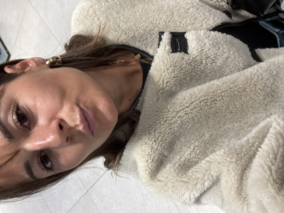 A forensic description of the image reveals a close-up, slightly upward-angled selfie of a single female subject in an indoor setting within Saint-Laurent-du-Var, France. The subject, an adult female with brown hair and bangs, looks directly into the camera with her lips pursed in a kissing gesture. Her skin exhibits a slight sheen, particularly on the nose and forehead. She wears a cream-colored, textured faux shearling jacket with visible black trim and a black rectangular accent detail on the garment's right side (viewer's left). Underneath, a dark top is visible. A slender gold-colored chain necklace with small charms hangs around her neck, and a gold-colored hoop earring is present on her right ear. The background is out of focus, showing light-colored tiled flooring and indistinct reflections consistent with an interior public or commercial space. No other individuals or specific objects are clearly discernible in the background.