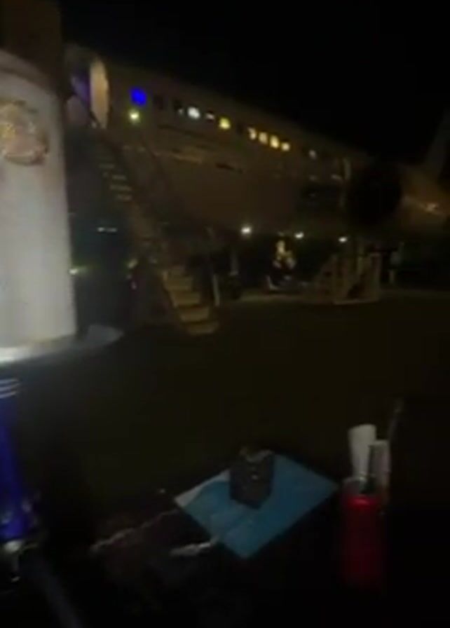 The video begins with a static shot of a hookah, then pans over to a woman sitting outside at night. She is using an electronic device, then inhales and exhales a cloud of smoke. The background includes hanging lights and what appears to be a converted airplane.