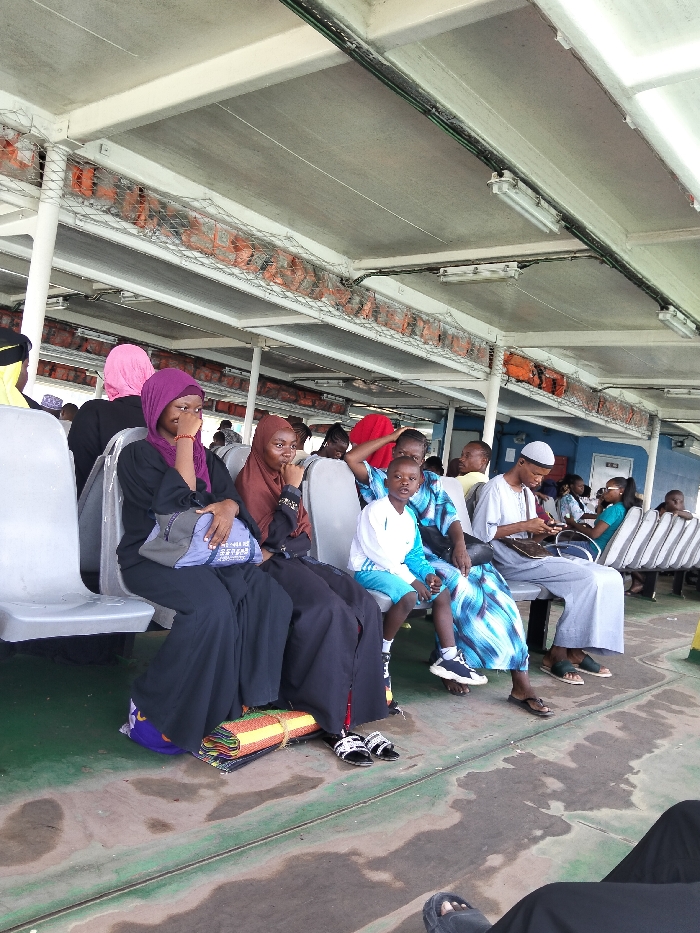 The image depicts the interior of a passenger ferry or vessel, likely operating near Mkomani ward, Kenya