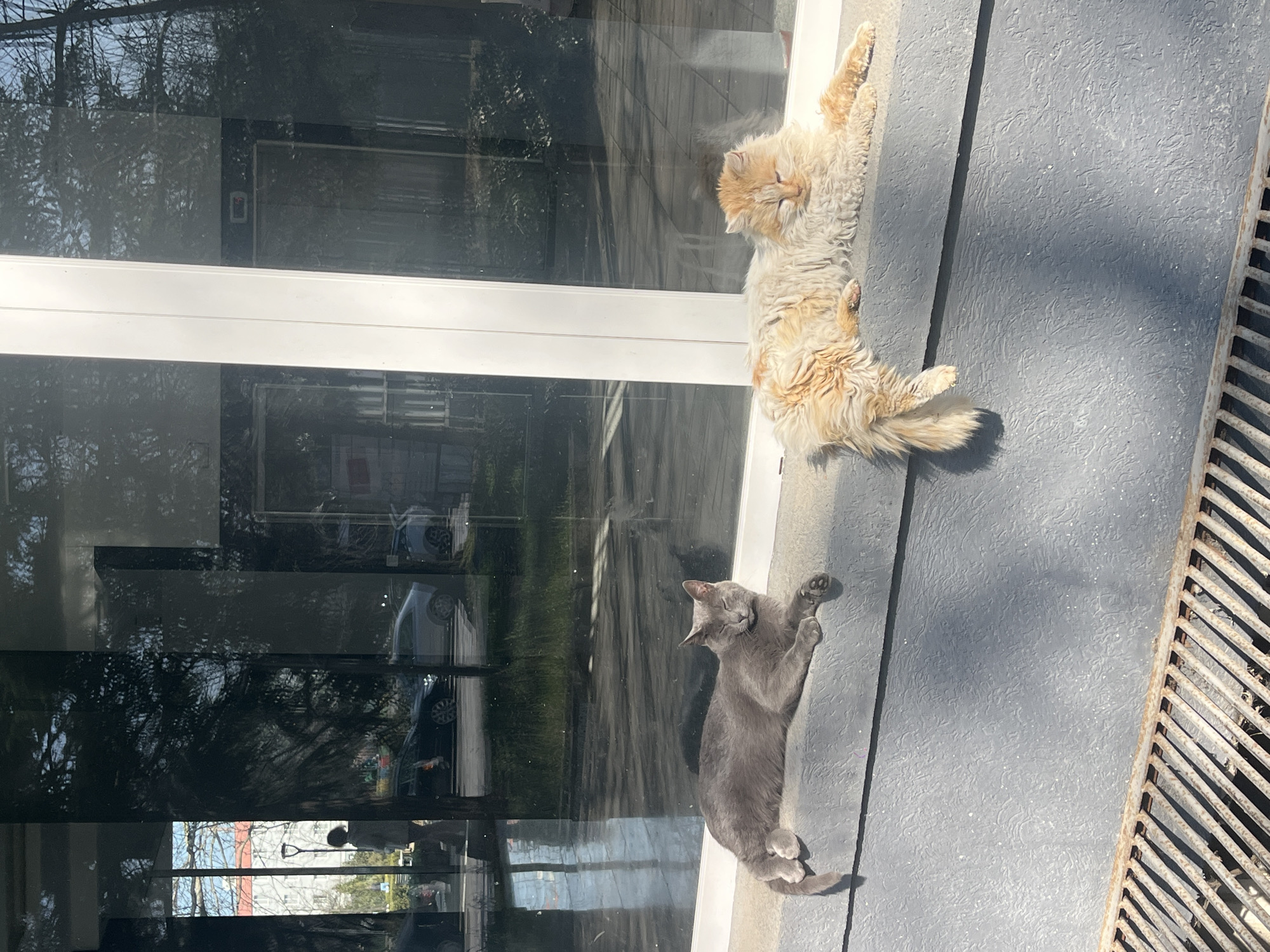 This scene is set in the city of Targovishte, Bulgaria. Two domestic cats are observed resting on a sunlit, textured grey concrete ledge, positioned against a building with large, reflective glass windows. The cat on the left is grey with short fur, lying prone with eyes closed, facing right. The cat on the right is orange-ginger with long, somewhat matted fur, also lying prone with eyes closed, facing left. Both cats appear to be basking in direct sunlight. Below the concrete ledge, in the immediate foreground, is a rusty metal grate. The reflective windows behind the cats reveal an urban environment. Visible reflections include deciduous and evergreen trees, a street lamp, a partial silhouette of a person standing or walking on a sidewalk, and multiple cars parked or in motion (including a black sedan and lighter-colored vehicles). Distant reflections show parts of a building, including a structure with a red roof. The lighting suggests a clear day with strong sunlight casting distinct shadows.