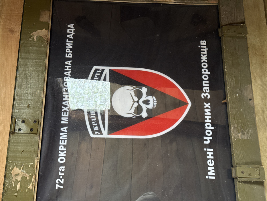 A black banner is displayed within an olive-green painted wooden frame in Moshchun, Ukraine