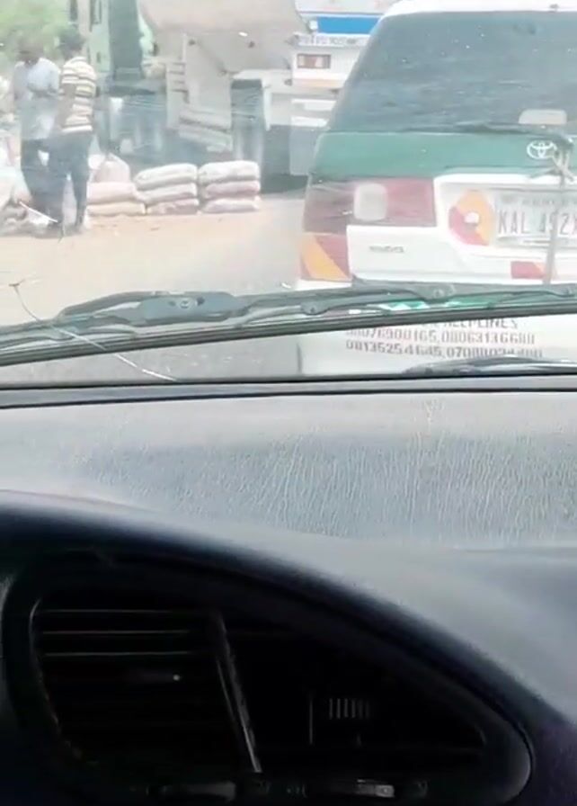 The view from inside a parked car shows a street scene. Visible through a cracked windshield are a group of people and two vehicles. One is a white truck with several bags of what appears to be cement stacked behind it. The second vehicle is a white minivan with green trim. The minivan's license plate reads KAL-492XA. The individuals are standing around and seem to be observing the bags of cement. The dashboard of the car from which the video is shot is visible in the foreground, including an air vent.