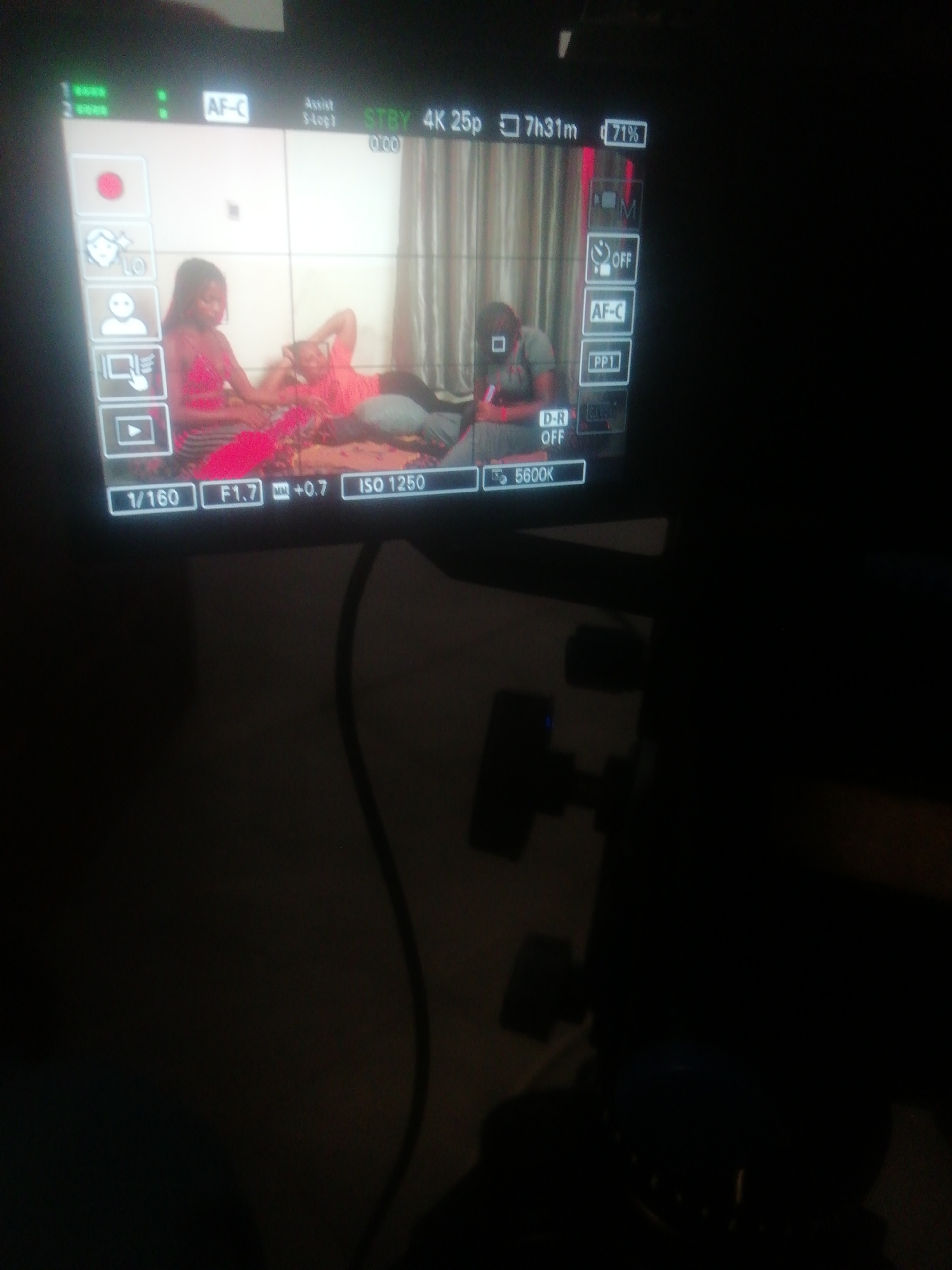 monitor screen displaying a scene of two people on a bed. A woman in a pink top and black and white striped pants sits on the edge of the bed while a man in a pink shirt lies reclined against a headboard. A second man sits at the end of the bed looking at his phone. Behind them are light-colored curtains. The camera settings displayed on the screen include 1/160 shutter speed, f/1.7 aperture, +0.7 EV compensation, ISO 1250, and a color temperature of 5600K. The monitor indicates 7 hours and 31 minutes of recording time with 71% battery. The camera is in standby mode, recording in 4K at 25 frames per second. The monitor and camera appear to be in a dark room. The location is Ikorodu, Nigeria.