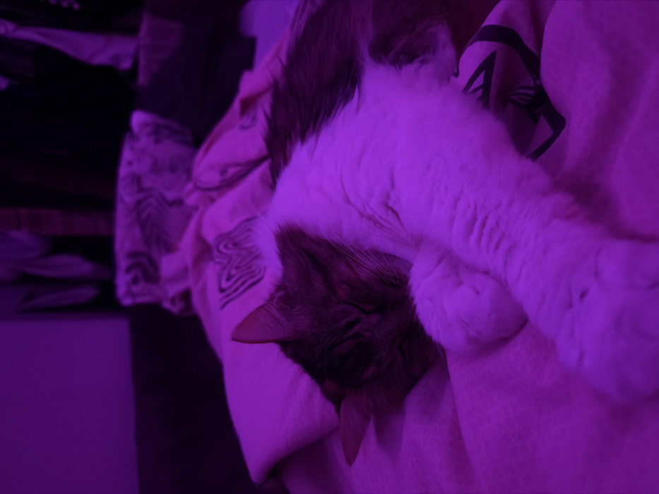 A furry cat sleeps curled up on a soft, patterned blanket. Its face is tucked away, and its paws are gently curled near its head. The lighting casts a distinct purple hue over the scene. To the left, blurred shapes suggest a closet or storage area. The ambiance is warm and cozy, highlighting the pet's peaceful slumber.