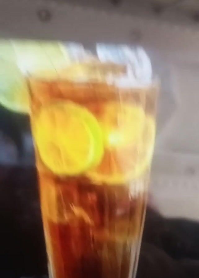 A close-up shot shows a partially full glass of a dark liquid, likely a beverage, with several lemon or lime slices inside
