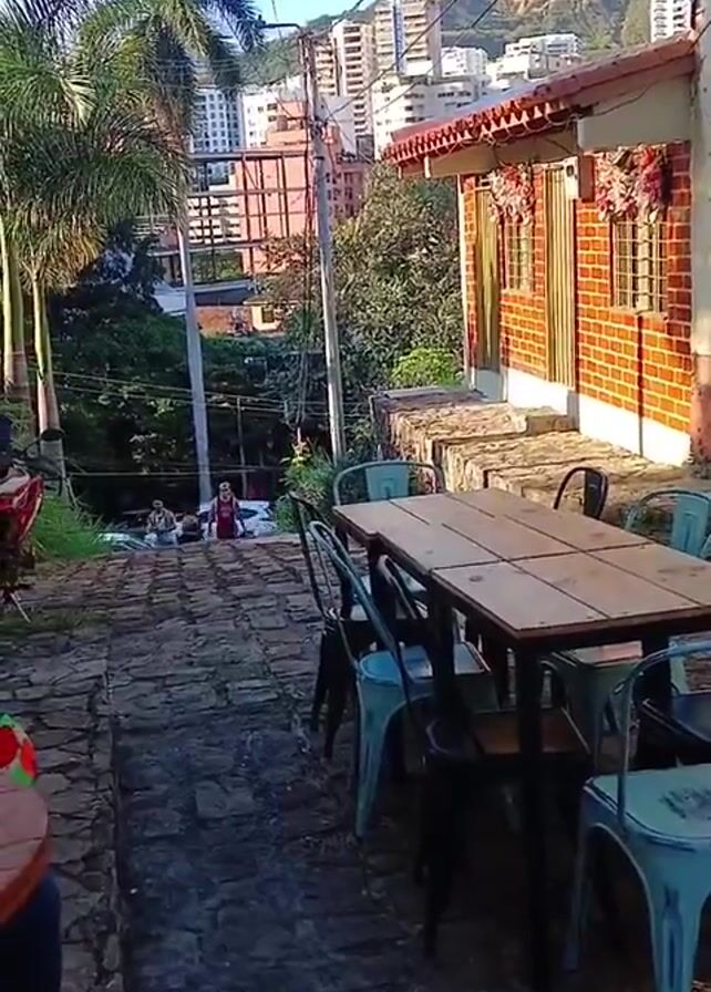 n outdoor scene of a narrow, stone-paved path leading downhill. On the right side of the path is a small building made of brick and white-painted sections. The building has several windows and a doorway visible. A wooden table with several chairs is placed in front of the building. The chairs are mostly turquoise and black metal. In the distance, there are high-rise buildings visible against a backdrop of a tree-covered mountain under a blue sky. A palm tree is visible on the left side of the path. There are people walking down the path in the distance. Someone is seated in the lower-left corner of the frame. Electrical wires are strung overhead. The sun appears to be shining, creating some shadows in the scene.