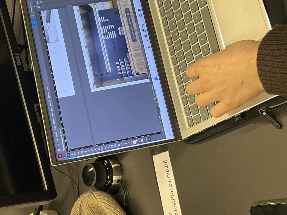 The image depicts an angled overhead view of a workstation. A silver-colored laptop occupies the central foreground, displaying Adobe InDesign software with an active document titled "PortfolioSheet.indd." The screen exhibits a placed 3D rendering of a contemporary interior space, specifically a cafe or bar counter with a light wooden finish. Behind the counter, a dark blue wall features two horizontal shelves holding small, light-colored objects, and a prominent horizontal light fixture. A person's right hand, displaying a small red mark or abrasion near the wrist, is positioned on the laptop's QWERTY keyboard. To the left of the laptop, on a dark desk surface, a beige knitted cap or beanie is visible next to a black and polished silver 3Dconnexion SpaceMouse Compact input device. A black Dell monitor is partially visible in the background, behind the laptop. A white piece of paper on the desk, left of the laptop, displays the text "oJestPracownia29!". In the lower-left corner, a dark-colored smartphone is partially visible. The laptop rests upon a black zippered sleeve or pad. The taskbar on the laptop also shows a weather widget indicating "2°C" and "5°C". This scene is located within a design studio or academic workshop, specifically "Pracownia 29" (Workshop 29), in Poznan, Poland, as indicated by the Polish inscription on the paper.