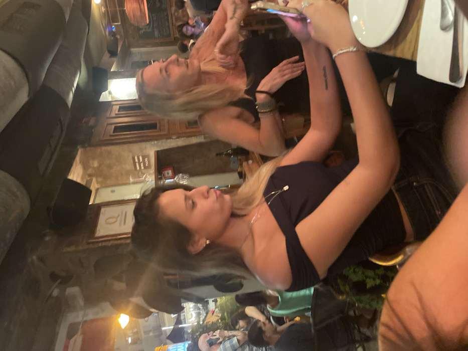 The image depicts an indoor scene within a dimly lit restaurant or bar, likely located in an unknown city where Hebrew is spoken, as evidenced by a brown sign displaying Hebrew text ("שירותים" and "יציאה"). The establishment features stone walls, wooden doors, a chalkboard, and rustic light fixtures. In the mid-ground, a young adult female with long brown hair and blonde highlights, wearing a dark off-the-shoulder top and dark pants, is seated at a table. She is holding a smartphone with both hands, positioned as if taking a photo or video, and has a tattoo on her right forearm and a silver beaded bracelet on her left wrist. To her right, an adult female with long blonde hair and a black tank top is seated, observing something off-frame with her left hand resting on a surface. Her left wrist displays multiple dark beaded bracelets. A white plate with a fork and knife is visible on the table in the bottom right. In the blurred background, other patrons are discernible, including a bald man speaking on a phone to the far left and a woman in a light green top seated at a table. Overhead, air ducts are visible, and a framed "Q" emblem adorns a wall. Bottles are present on a shelf in the background. The overall environment suggests an evening dining or social setting.