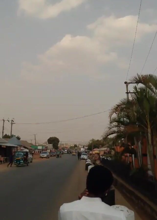The video begins with a shot of a slightly cloudy sky and gradually reveals a view of a street in a small town. The street is straight and features light traffic, including cars and motorcycles. On the left side of the road, there are small shops or buildings, while the right side features palm trees and other vegetation. A man wearing a white shirt and a black cap is walking along the side of the road, away from the camera, and possibly filming. The sky appears slightly hazy.