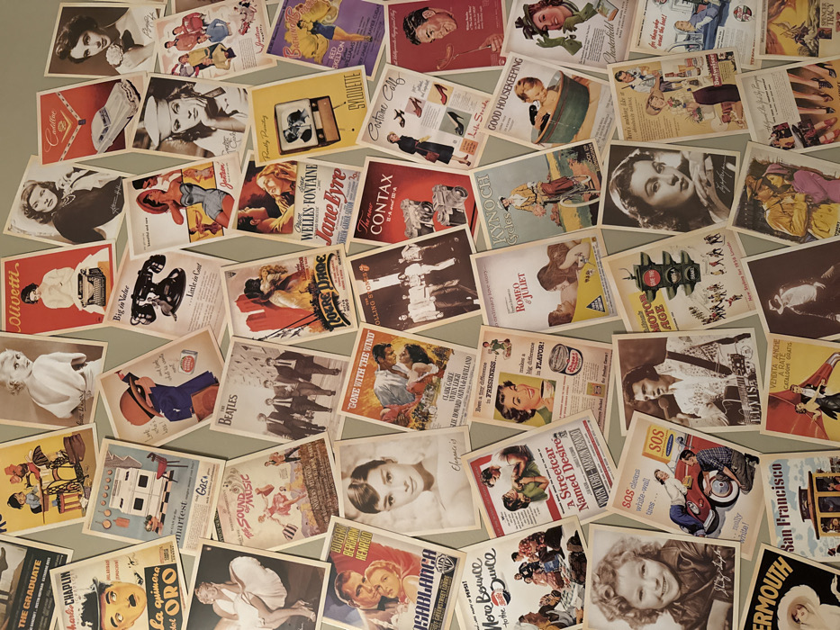 The image presents a collage of vintage advertisements, magazine covers, and movie posters. There are ads for products such as Cadillac, Pepsi, Olivetti typewriters, and Contax cameras. Movie posters for films like "Casablanca", "Gone With The Wind", "Romeo and Juliet", "The Graduate" and "Rocke Blade" are also displayed. Some magazine covers include "Good Housekeeping". The image evokes a sense of nostalgia.
