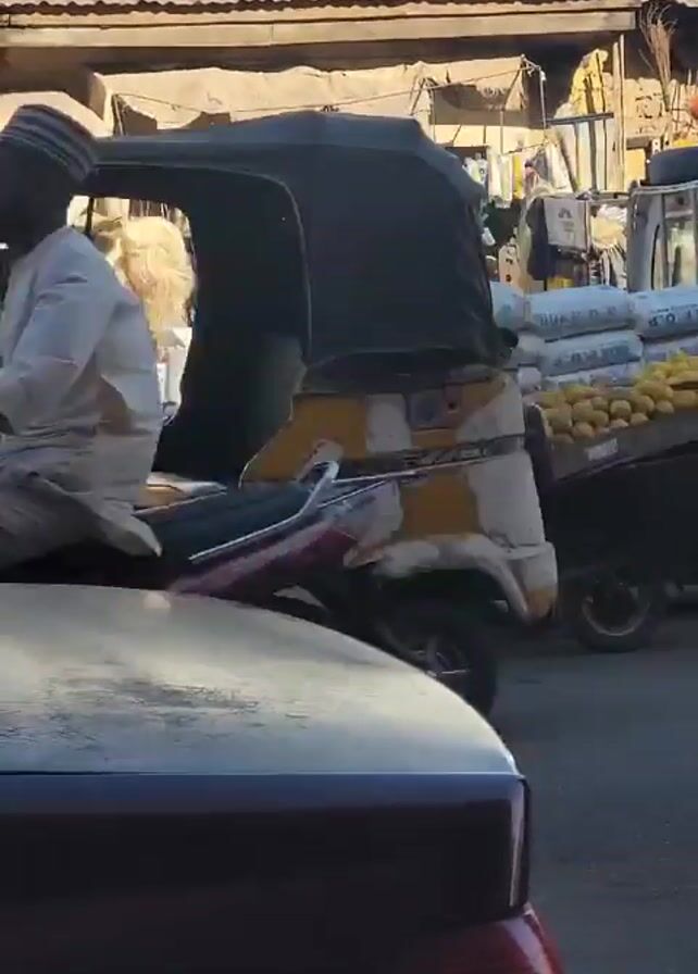 street scene in what appears to be a bustling market area. In the initial frame, a yellow and black three-wheeled vehicle, possibly a rickshaw or auto-rickshaw, is visible with a person seated inside. Stacks of building materials or supplies can be seen in the background, indicating a construction or hardware business nearby. As the video progresses, the camera shifts to reveal a cart laden with yellow fruit, possibly oranges or lemons, in front of a shop. People are seen interacting with the cart and potentially making purchases. The shop appears to be a mobile phone SIM card registration center based on the prominent yellow sign of a mobile telecommunications company. The overall environment suggests a typical urban market with a mix of goods and services available.