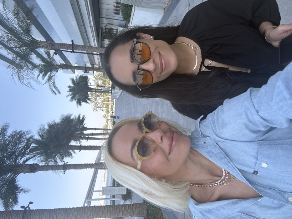 A selfie depicts two adult females positioned on a paved waterfront promenade in a modern district of Dubai, United Arab Emirates. The woman on the left exhibits shoulder-length blonde hair, wears a light blue denim collared shirt, and multiple layered necklaces, including one with pink stones. She wears translucent yellowish-framed round sunglasses with dark lenses and displays a slight smile. The woman on the right has long dark hair, wears a black long-sleeved top with a v-neck and tie detail, layered gold-toned necklaces, and dark-framed round sunglasses with orange-tinted lenses. She holds a black smartphone in her left hand, likely capturing the image, and also displays a slight smile. The background features a wide paved promenade lined with mature palm trees under a clear blue sky. To the left, a body of water, indicative of a canal or marina, shows distant visible landmasses and structures. To the right, a contemporary, multi-story building with a smooth, light-toned facade and horizontal architectural elements is present. A single individual is discernible walking further down the promenade in the background.