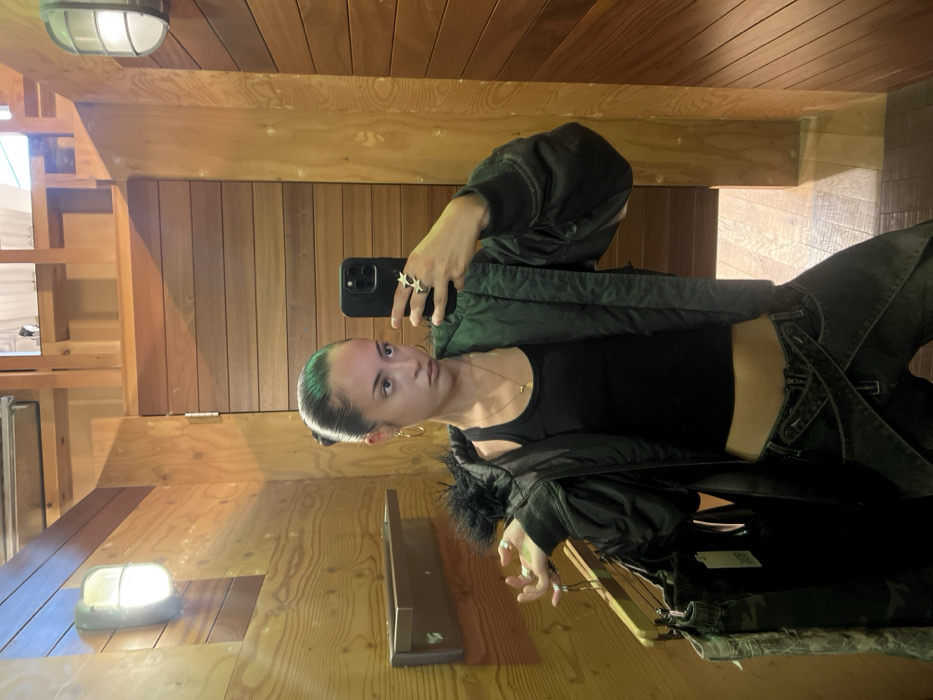 A young person, identified by dark hair pulled back, takes a mirror selfie inside a wood-paneled changing room