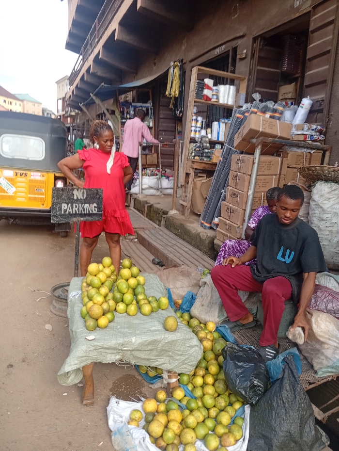 The image depicts an outdoor street market scene in Fegge, Nigeria