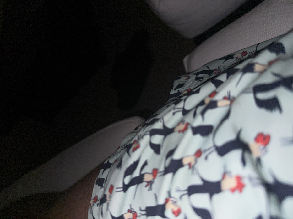 person sitting in what appears to be a car, judging by the dark window and seat. The person is wearing a light blue button-down shirt with a repeated pattern of black figures holding red objects. The shirt is slightly wrinkled and out of focus, particularly towards the right side of the frame. A white seat and part of a cushion are visible near the top, providing a sense of depth within the car's interior.