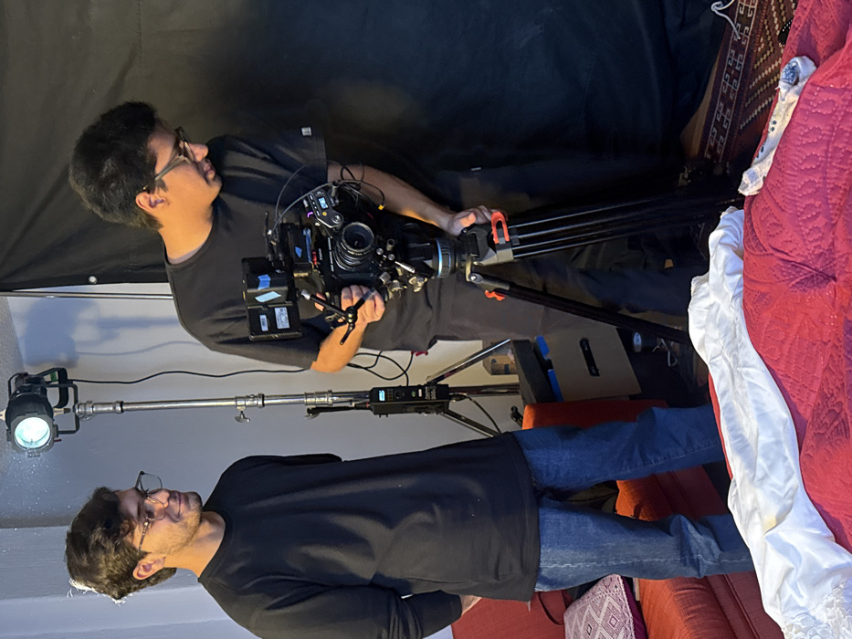 Two people are working on a film set. The first person stands in the foreground, wearing jeans, a long-sleeved black shirt, and glasses. He is looking toward the background. Behind him, the second person stands operating a professional camera mounted on a tripod. This person wears a black t-shirt and glasses. A boom mic and a lighting fixture are visible on a horizontal bar. A black backdrop, part of a red sofa, and a white garment lay in the scene.
