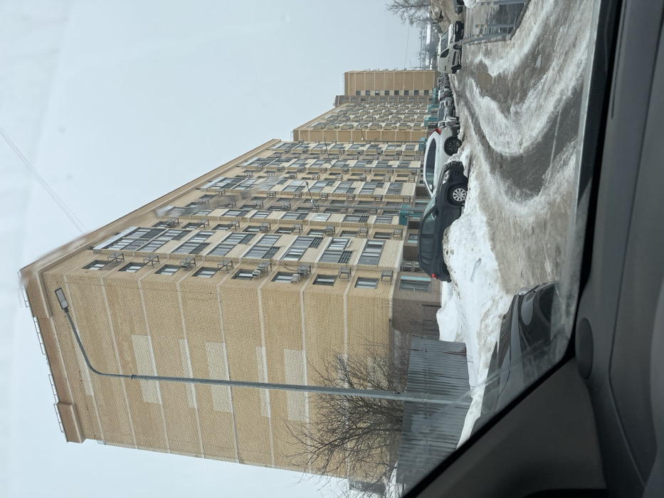 The image depicts a winter street scene in Nekrasovskiy, Russia, viewed from inside a vehicle. A large, multi-story residential building with light brown brickwork and numerous windows, balconies, and external air conditioning units dominates the left and center. A tall, grey street light pole stands in the mid-ground on the left, partially obscuring the building. The ground is covered in significant amounts of melting snow and slush, with visible tire tracks on the wet, icy asphalt surface of a street or parking area. Several vehicles are parked along the street, including a dark SUV in the foreground, partially covered by a snowdrift, and a white SUV behind it. Other buildings of similar architectural style extend into the background on the right. Bare deciduous trees and bushes are visible on the far left, behind a corrugated metal fence. The sky is uniformly overcast. The bottom portion of the image shows the dashboard and A-pillar of the vehicle from which the photograph was taken. No individuals are visible.