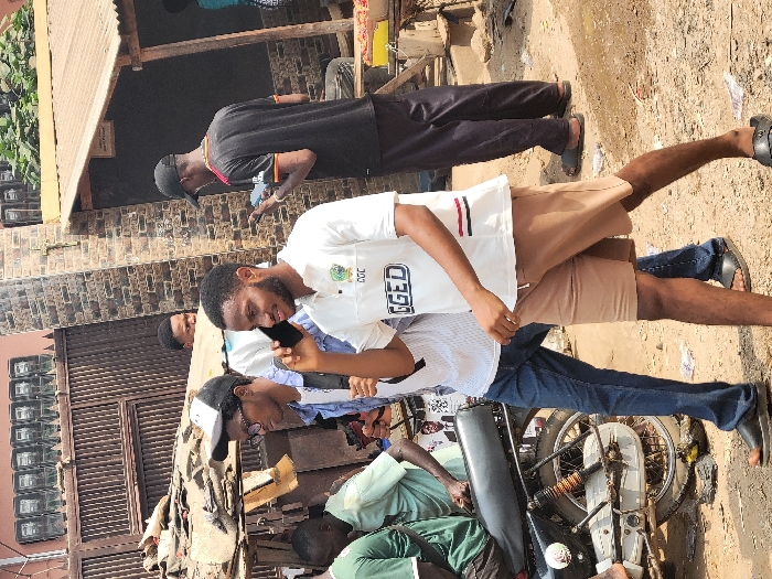 The scene depicts a bustling street or market area in Awka, Nigeria, under bright daylight. In the foreground, a young man with a beard and dark skin, wearing a white polo shirt (featuring "CGC" and "GGED") and brown shorts, walks towards the right, smiling while holding a black smartphone to his right ear. He wears black slide sandals. Immediately to his left and slightly behind, another young man with dark skin, wearing a black and white baseball cap, glasses, a light open shirt over a darker inner shirt, and blue jeans, also walks towards the right. A dark strap is visible over his right shoulder, and he wears black sandals. In the midground to the right, a man with dark skin, wearing a black baseball cap, a black t-shirt with red/orange sleeve stripes, and dark pants, stands facing away from the camera, examining a white smartphone. He is positioned next to a rustic stall featuring a corrugated metal roof and wooden supports, with red produce visible on its surface. To the left in the midground, a black motorcycle with a grey seat and an orange rear shock absorber is parked. A man in a green t-shirt is partially visible near the motorcycle. Another man in a light green shirt is partially visible behind the motorcycle. The background features a brown brick wall with a dark metal gate. Mounted above the gate are multiple grey, box-like structures, likely utility meters. Green leafy vegetation is visible above the stall roof and over parts of the brick wall. A small, dark cross is affixed to the brick wall. The ground is unpaved dirt with scattered litter, including white paper debris. A faded poster featuring a man's face is partially visible near the motorcycle.