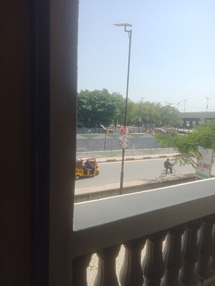 This image, viewed from an elevated perspective, captures a daytime street scene in Gandu Albasa, Nigeria. In the immediate foreground, a dark brown vertical architectural element is on the left, and a light-colored concrete balcony railing with decorative balusters runs horizontally across the bottom. The scene beyond the railing features a multi-lane paved road. A yellow motorized rickshaw, carrying at least three individuals, is traveling left-to-right on the road. Further right, a male individual on a bicycle is also moving left-to-right. A prominent black lamppost with a solar panel on its top stands in the center, next to a concrete road divider featuring green and white patterned sections. A white rectangular sign with red text is affixed to the lamppost. Beyond the road divider, an elevated section displays several other yellow motorized rickshaws and lush green trees. In the far background, a large concrete overpass or bridge structure is visible under a clear, bright blue sky. Other streetlights are discernible in the distance.