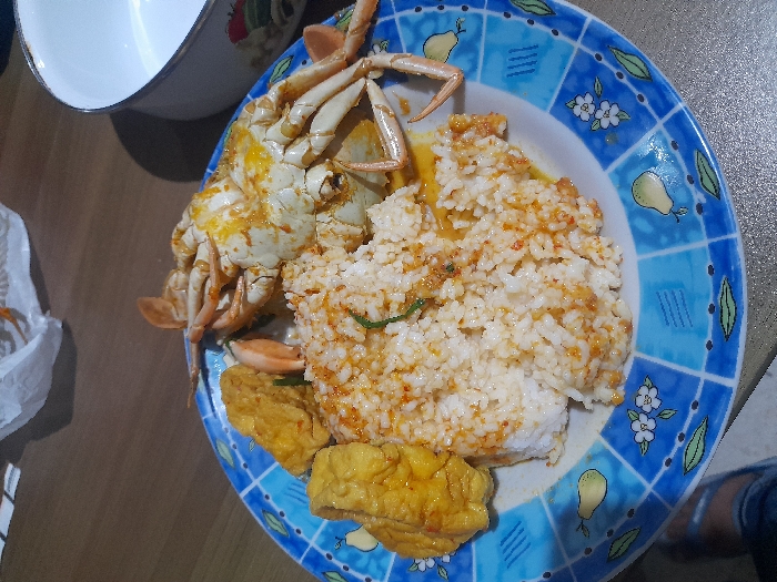 A plate holds a meal of rice, tofu, and crab. The rice is topped with a reddish sauce. Three golden-yellow squares of tofu sit at the bottom left of the rice. A cooked crab with orange and yellow sauce rests beside the rice and tofu, with its legs extending over the edge of the plate. The plate has a blue and white decorative pattern with images of pears and flowers. Part of a white bowl is visible at the top left of the frame.
