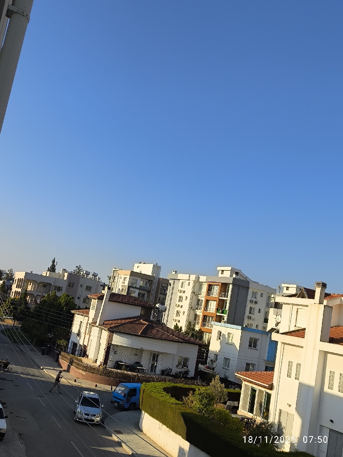 An elevated view captures a street scene with houses and apartment buildings under a clear blue sky. A person walks across the street near a silver car and a small blue truck. Manicured green hedges line the sidewalk. The buildings vary in height and architectural style, some with terracotta roofs and others with modern white facades. Power lines traverse the scene, adding to the urban landscape.