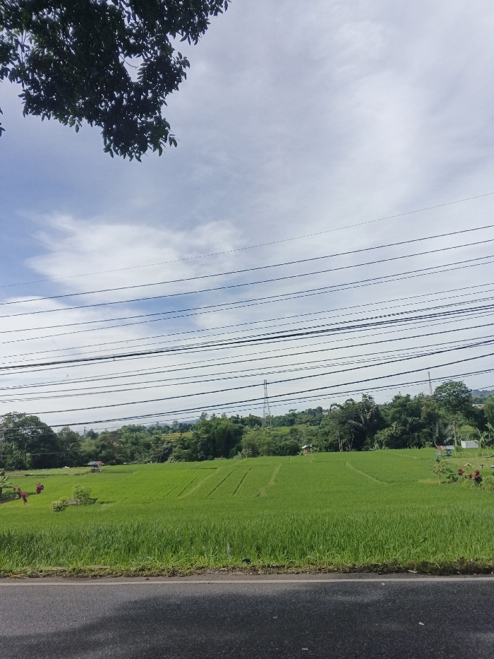 Lush green rice paddies extend towards a backdrop of rolling hills densely covered in trees. A multitude of electrical wires stretch across the sky, partially obscuring the view. A utility pole rises in the distance. In the foreground, a dark grey road runs parallel to the rice field. A tree branch with dark leaves hangs down from the upper left corner of the frame, partially obscuring the partly cloudy sky.