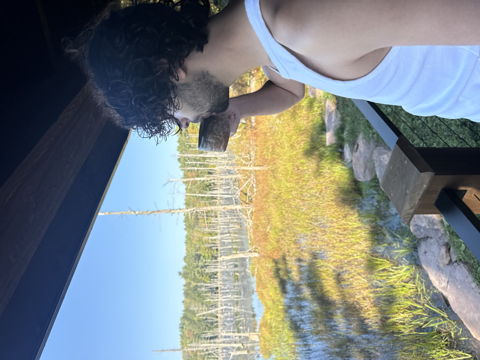 In Otego, United States, a male individual is captured from the right side, mid-torso up, standing on a porch or balcony. He possesses dark, curly hair and a short beard, dressed in a white ribbed tank top. The man is actively drinking from an earth-toned, textured cup, holding it to his lips, while looking out towards a natural wetland environment. The background displays a body of water with numerous bare, dead trees (snags) standing within it. Extensive patches of green and yellow-orange reeds or tall grass grow in and around the water, with a distant treeline of living trees exhibiting green and autumnal foliage. The sky is clear and blue. In the foreground, a dark brown wooden railing with metal wires and a stone path are visible. A dark wooden beam from an overhead structure extends across the top of the frame.