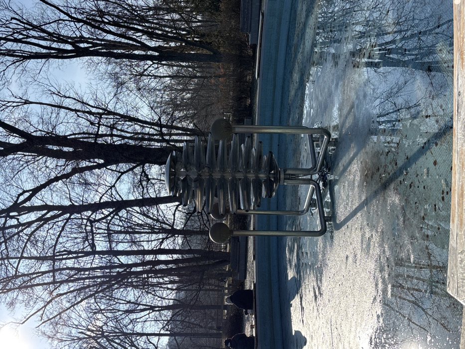 The image captures the "Chamber Fountain" (Komorní kašna) sculpture by Michal Gabriel in Kampa Park, Prague, Czechia, under bright daylight during a cold season. The foreground features a large, circular fountain basin, mostly covered by a reflective layer of ice and standing water, with some debris visible on its blue-tiled base. The central sculpture is a polished metal structure composed of a vertical shaft supporting numerous horizontal, curved fins, resembling stacked blades, all supported by four arched metal legs descending into the icy basin. Long, distinct shadows from the sculpture are cast onto the ice. In the mid-ground, two individuals are seated on a wooden park bench to the left, wearing dark, heavy clothing, with their backs to the camera. The background consists of a dense arrangement of tall, leafless deciduous trees under a clear blue sky, indicative of late autumn or winter. Additional empty wooden benches are visible further into the park area.