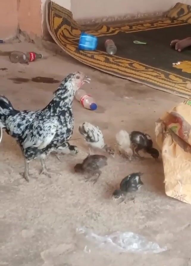speckled hen standing on a concrete floor, surrounded by her chicks. Some of the chicks are dark brown, while others are light gray or white. The hen appears to be calling to her chicks, and they are clustered near her. In the background, there is a worn mat with a yellow and black pattern. Several empty plastic bottles are scattered around the floor, including a Coca-Cola bottle. A burlap sack sits to the right of the chickens, and a bare human foot is visible on the mat.