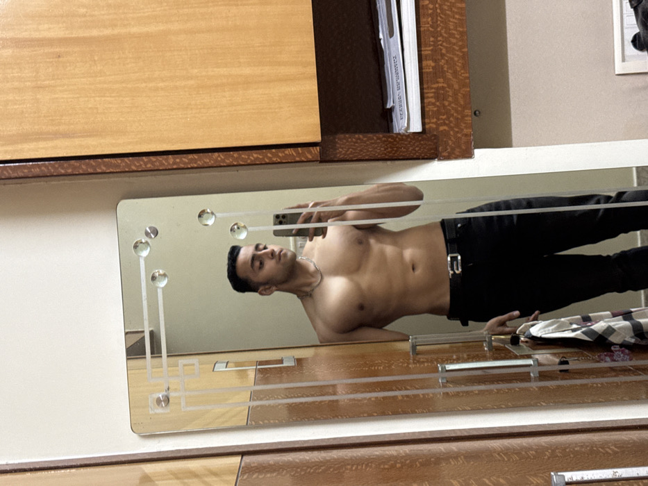 An individual is depicted taking a mirror selfie in an indoor setting. The specific location within Kolkata, India, cannot be determined from the visual evidence. The subject is a young adult male with a muscular physique, shirtless, wearing black trousers and a black belt with a silver buckle. A silver chain is around his neck, and an earring is visible in his left ear. He holds a smartphone in his right hand, capturing his reflection in a rectangular mirror featuring etched geometric patterns and circular embellishments. The mirror is mounted on a light-colored wall. To the left of the mirror, a dark brown wooden wardrobe door is partially visible. To the right, a lighter brown wooden cabinet or wardrobe unit is present, with an open shelf below it containing stacked papers. A white and brown plaid garment hangs near the lower left edge of the mirror. The flooring is a light-colored tile or stone.