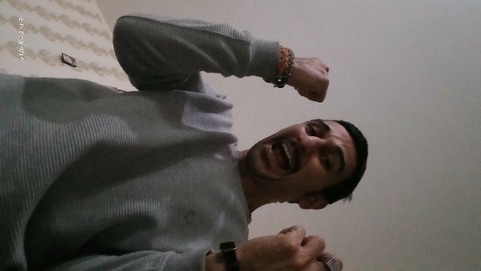 A man wearing a gray long-sleeved shirt is shown from a low angle, with his head near the bottom and his body extending upwards. His mouth is open in an expression, possibly yelling. He has a dark mustache and short hair. One arm is raised with a fist clenched, adorned with a beaded bracelet. The other hand, also clenched, is visible closer to the camera with a watch. A light-colored wall is in the background.