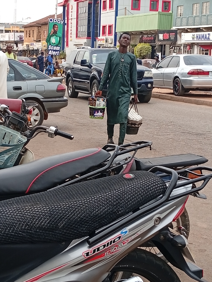 The image portrays an urban street scene in Jos, Nigeria, observed from a low vantage point behind two parked motorcycles. In the midground, a young adult male, dressed in a dark green traditional tunic with matching trousers and dark shoes, walks towards the viewer. He holds a white basket filled with white eggs in his left hand and a multicolored basket containing packaged goods in his right hand, indicating his role as a street vendor. His gaze is directed slightly upwards and ahead. In the immediate foreground, the handlebars and seats of two motorcycles are partially visible. The closer motorcycle is silver with red and black accents, featuring a black mesh seat cover and the inscription "UDIO JC110-S" on its side panel. The street, paved with asphalt, features a mix of moving and parked vehicles. A grey sedan is visible to the left, while a dark blue SUV is positioned behind the walking vendor. Further right, a silver sedan is parked. The background is characterized by multiple-story commercial buildings. A prominent building on the left exhibits red and blue architectural detailing. A street pole features an "OPay Scam Alert" advertisement displaying a man in a green shirt. To the right, another building facade is light green, bearing signs for "Colonel's" and "HAMAZ." Several other pedestrians are present in the background. The scene is illuminated by natural daylight.