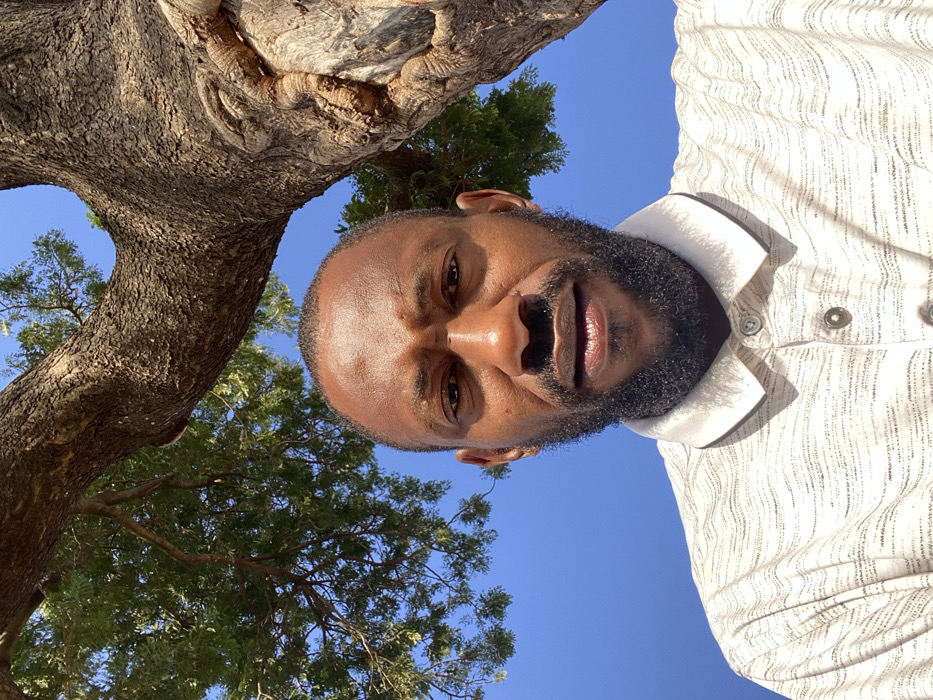 A man with a beard poses for a selfie, looking down at the camera. He has a shaved head with shiny skin. He is wearing a light-colored, button-down shirt with visible buttons. Behind him is a tree with green leaves, contrasted against a clear, blue sky. The angle is from below, giving a unique perspective of the scene.