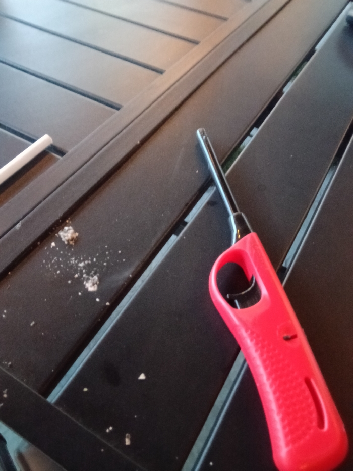 The image displays a close-up, downward-angled view of a dark, slatted tabletop, located in the city of Los Angeles, United States of America. A red, long-necked utility lighter with a black metal igniter tip rests diagonally across the right half of the table surface, its textured handle facing the viewer. To the left of the frame, a segment of a white, cylindrical object, consistent with a cigarette filter or rolled paper, is visible. Adjacent to this white object, a small accumulation of white and light gray granular residue, consistent with ash or fine crumbs, is scattered across the dark table surface. No individuals are present in the frame, and the objects appear static. The background beyond the table is out of focus.