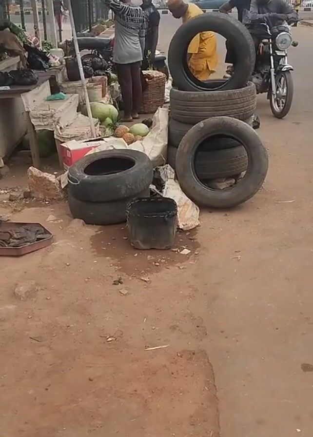 street scene, possibly a roadside market or a small commercial area. In the foreground, there are several used tires stacked and lying on the ground, along with a dark-colored container. Behind the tires, a simple stall or stand is visible, with various items displayed, including vegetables, fruits, and other goods. People are present in the background, some appear to be shopping, and another individual in a yellow garment is interacting with the goods. A motorcycle with two riders is seen in the background as well. The ground is a dirt or unpaved surface. The overall impression is that of a busy, informal market or commercial area.