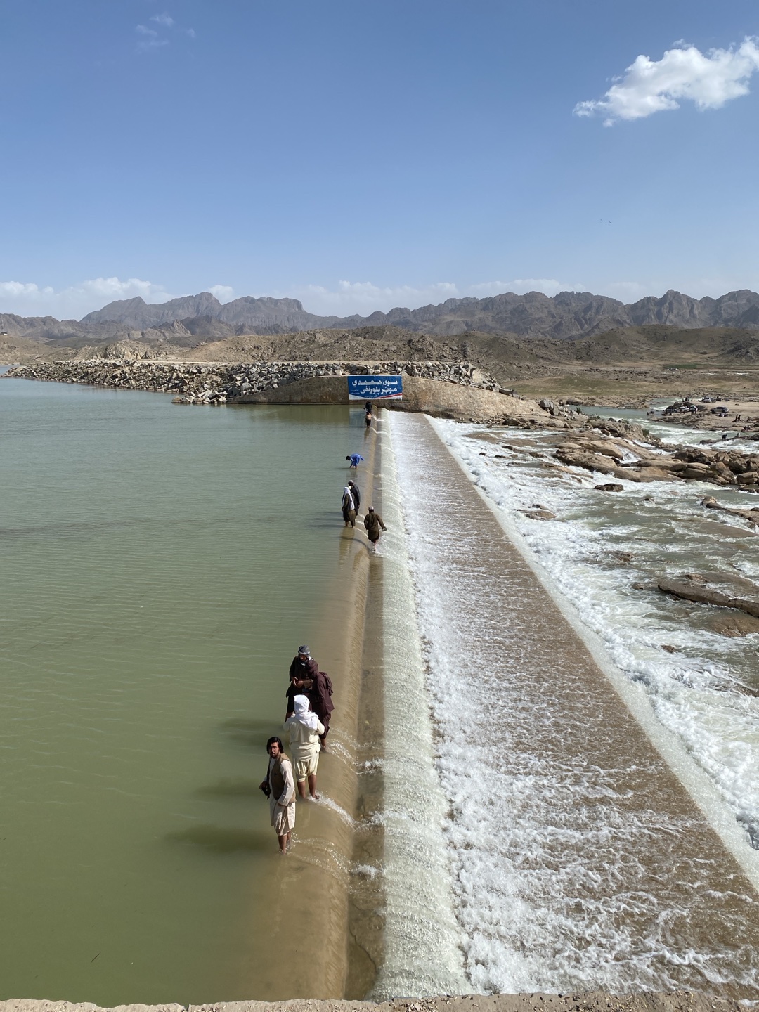 wide shot of a weir or dam in Kim, Afghanistan. The water behind the dam is calm and pale green, while the water flowing over the dam is frothy and white. A group of men, dressed in traditional Afghan clothing, are wading across the dam. The background features arid, rocky terrain and mountains under a bright blue sky with some clouds. A sign is visible on the far side of the dam, but the text is unreadable.