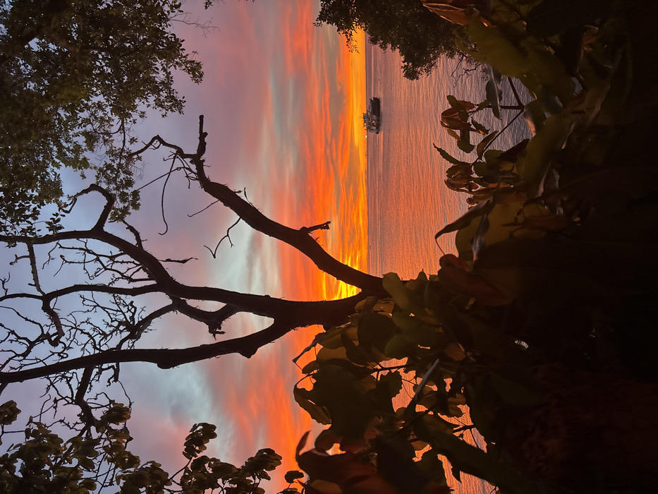 The image displays a coastal sunset scene in Tambon Ko Tao, Thailand. The sky is dominated by intense orange, red, and yellow colors near the horizon, blending into lighter orange, pink, and pale blue-grey towards the top of the frame, with visible horizontal cloud streaks. The foreground is largely comprised of the dark silhouettes of a prominent, multi-branched deciduous tree extending from the lower-left, and dense tropical foliage at the bottom and lower-right, framing the view. The ocean surface reflects the vivid sunset colors, appearing orange and red with subtle undulations. In the mid-right section of the ocean, a large vessel, resembling a ferry, is visible with illuminated sections on its hull and superstructure, positioned against the colorful horizon. Other distant, faint lights or objects are discernible on the horizon to the left of the main vessel. No individuals are present in the scene.
