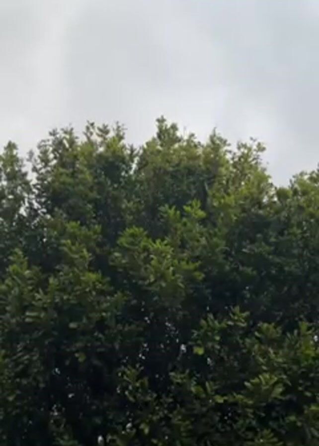 tall, leafy tree against a cloudy sky. The leaves are a vibrant green, and the branches are densely packed. The sky is overcast, with a light grey color. There are no people or objects visible in the video other than the tree and the sky. The camera appears to be stationary.