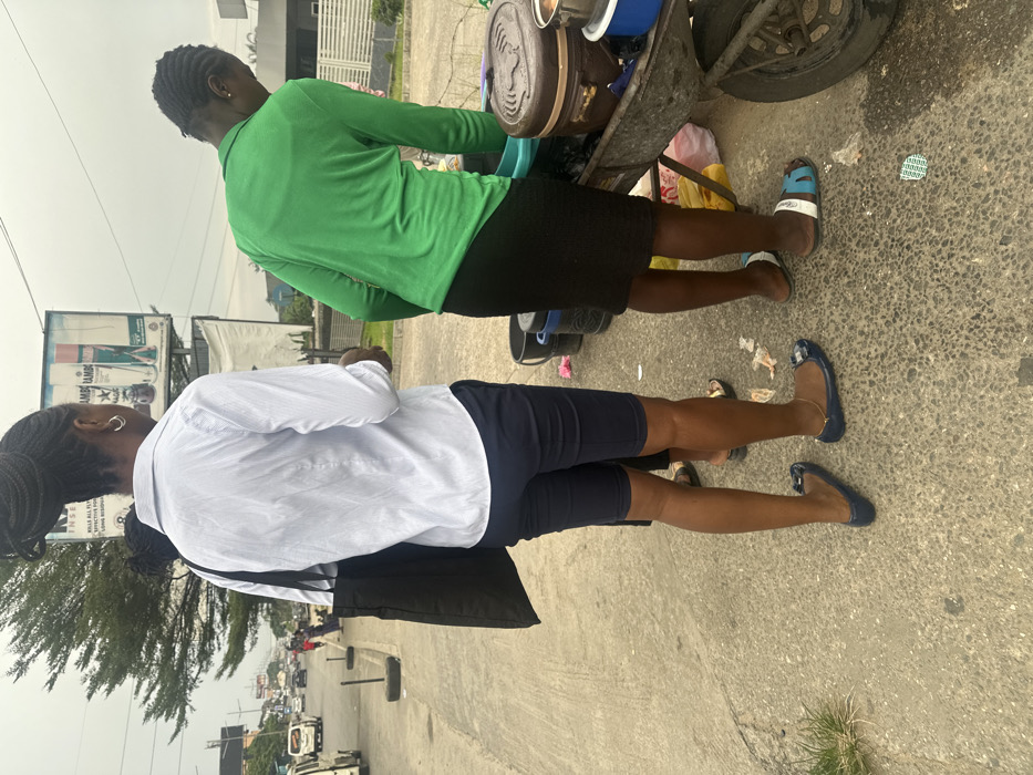 Two women stand beside a cart filled with cooking supplies. One woman, in a green shirt and black skirt, faces the cart. The other woman, in a white shirt and navy shorts, faces away from the cart and towards a busy street. She carries a black bag. The cart appears to have pots and buckets. They both wear sandals or flats. The background shows a street scene with a billboard, trees, and passing cars.
