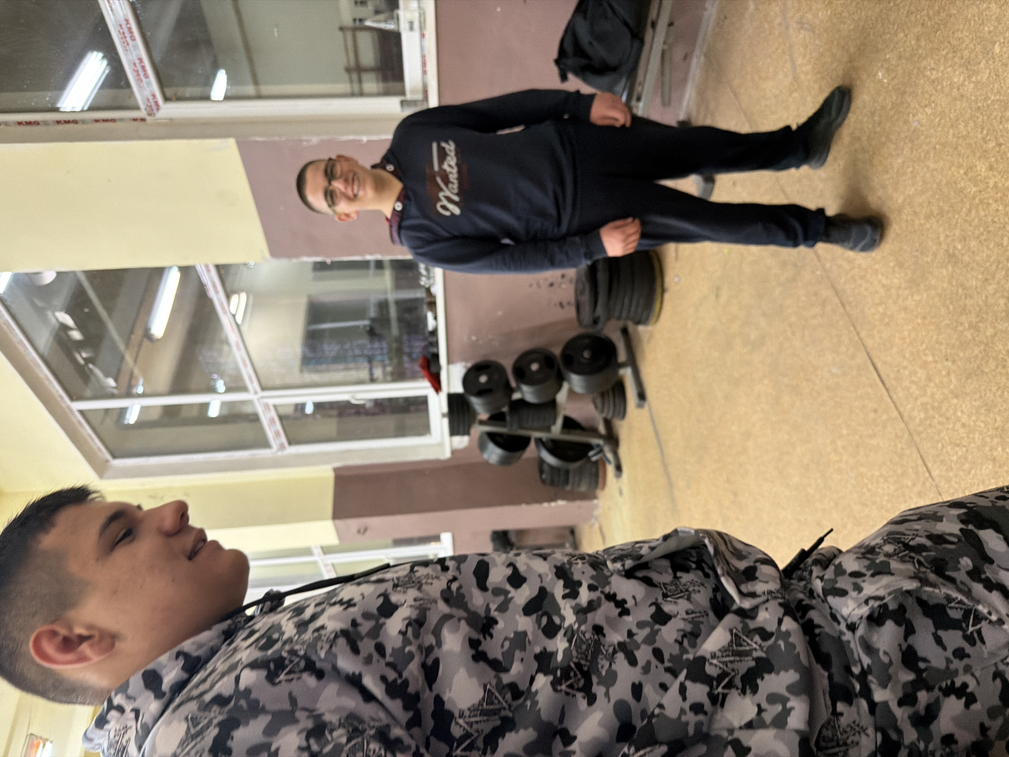 two males inside a gym. One male is wearing a grey and black camouflage patterned jacket, and the other male, standing in the background, is wearing a navy blue sweatshirt with the word "Wanted" printed on the front, along with black pants and shoes. The gym contains weightlifting equipment, including dumbbells and weight plates. The gym appears to be in a building with large windows. The image does not provide sufficient information to identify the specific location within the city of Panagyurishte, Bulgaria.
